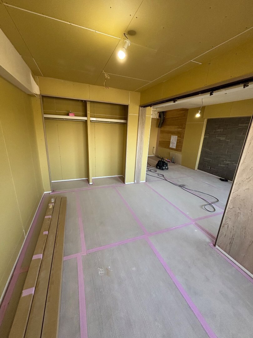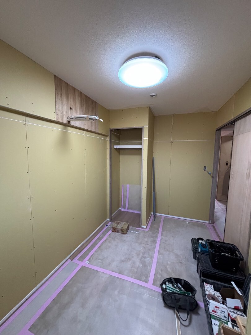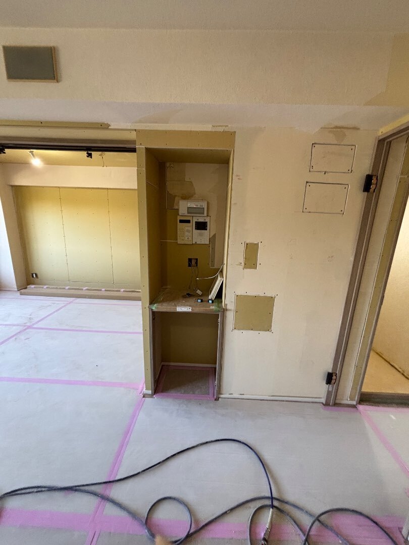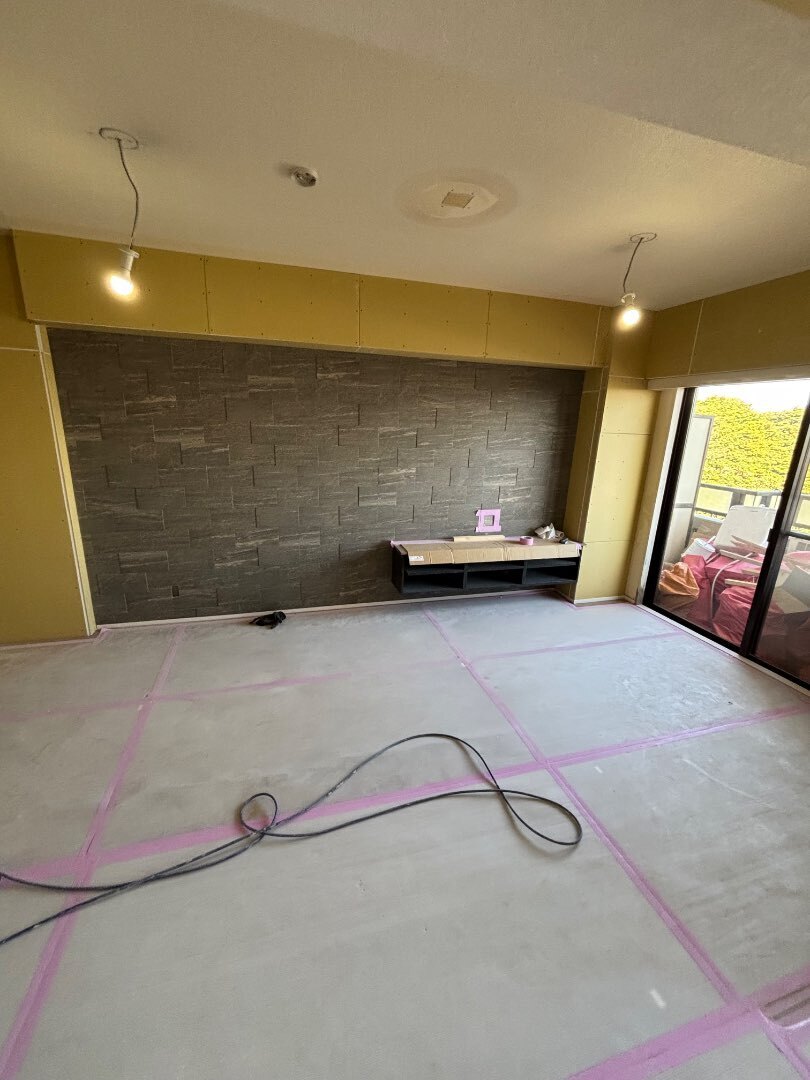 今回はTVボード設置面にエコカラットを取付けする普段とは違う完成予定なので、クロスを貼った後に、どのような姿になるのか楽しみです!